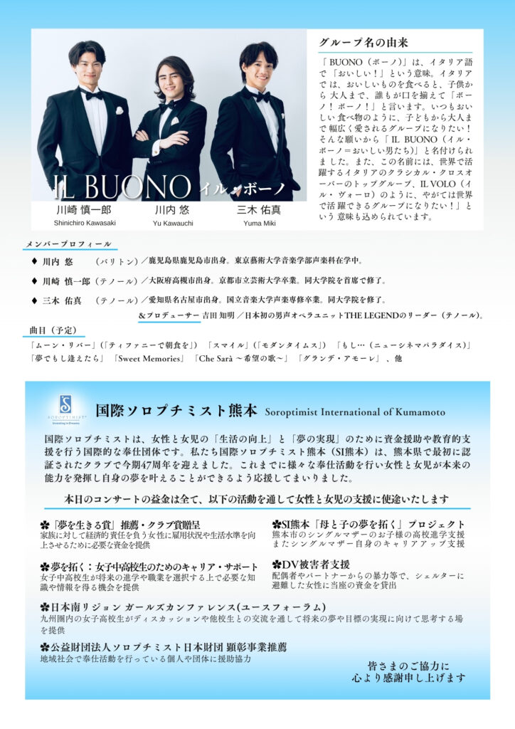 クラシカル・クロスオーバーの新星「IL BUONO」のプロデューサーは、かつて当クラブのチャリティー事業を数年間彩ってくださった5人組オペラユニット「ザ・レジェンド」のリーダー吉田知明様です。当日はよしだ吉田様も演出サポートのため同行されます。曲目はクラシックに留まらず、皆様にお耳馴染みの良い映画音楽なども幅広く予定しております。熊本ホテルキャッスルのお食事と共に、個性豊かな男声3人の凛として優しい、人の心に寄り添うハーモニーを心ゆくまでお楽しみください。